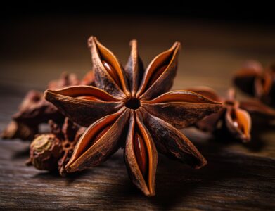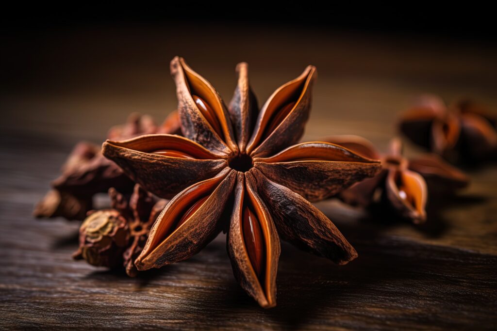 Star anise is a star-shaped spice known for its strong licorice-like flavor and distinct aromatic quality. It is obtained from the fruit of the Illicium verum tree, native to China and Vietnam. This spice is a key ingredient in many Asian cuisines, especially in Chinese five-spice powder and Vietnamese pho. Its unique shape, with eight pointed carpels containing shiny seeds, makes it easily recognizable and often used for decorative as well as culinary purposes.